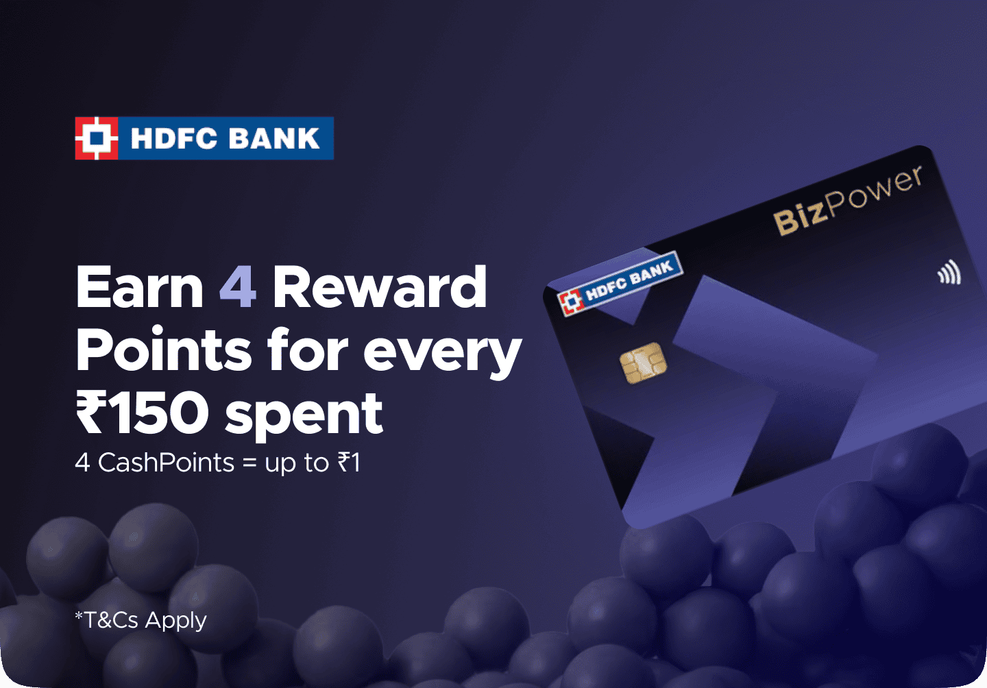 2Earn 4 Reward points for every ₹150 spent on eligible business expenses (with each point redeemable for up to ₹0.50), and earn 5X reward points on spends above ₹25,000 per statement cycle (up to 5,000 points) on bill payments via PayZapp & SmartPay, income tax and GST payments, and purchases from platforms like Google Ads and Reliance Digital