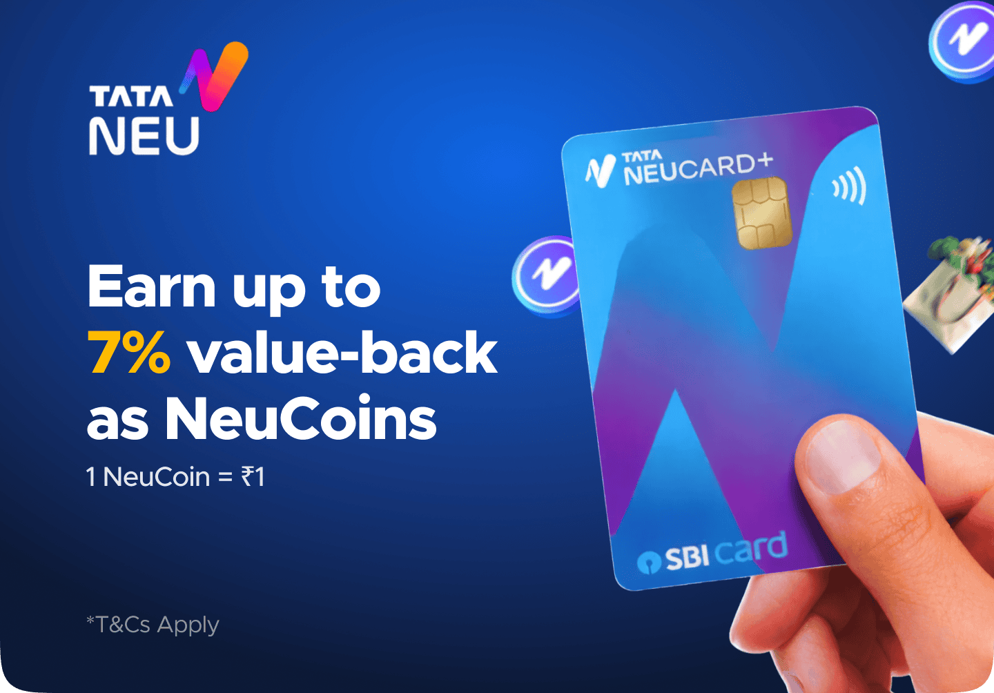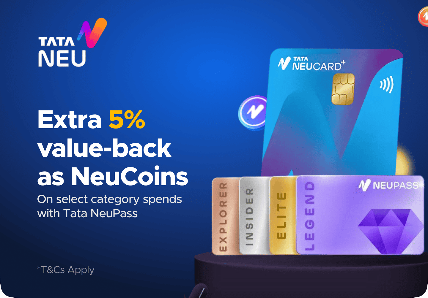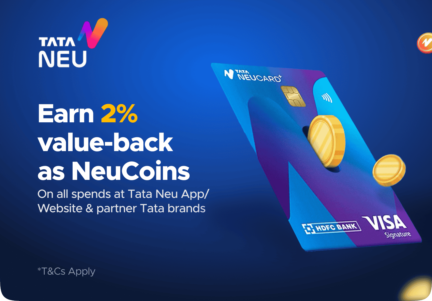 1Earn 2% value back as NeuCoins on all spends at Tata Neu App/Website and partner Tata brands, plus an extra 5% value back on select category spends with Tata NeuPass