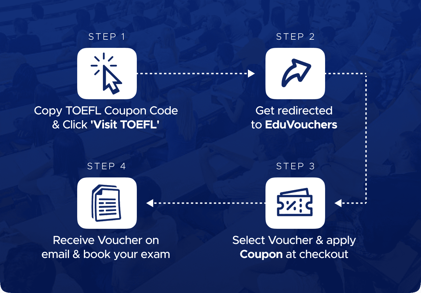 A. A TOEFL coupon code is a special discount code you can use when purchasing a TOEFL voucher from authorised sellers like EduVouchers to reduce your booking fee.