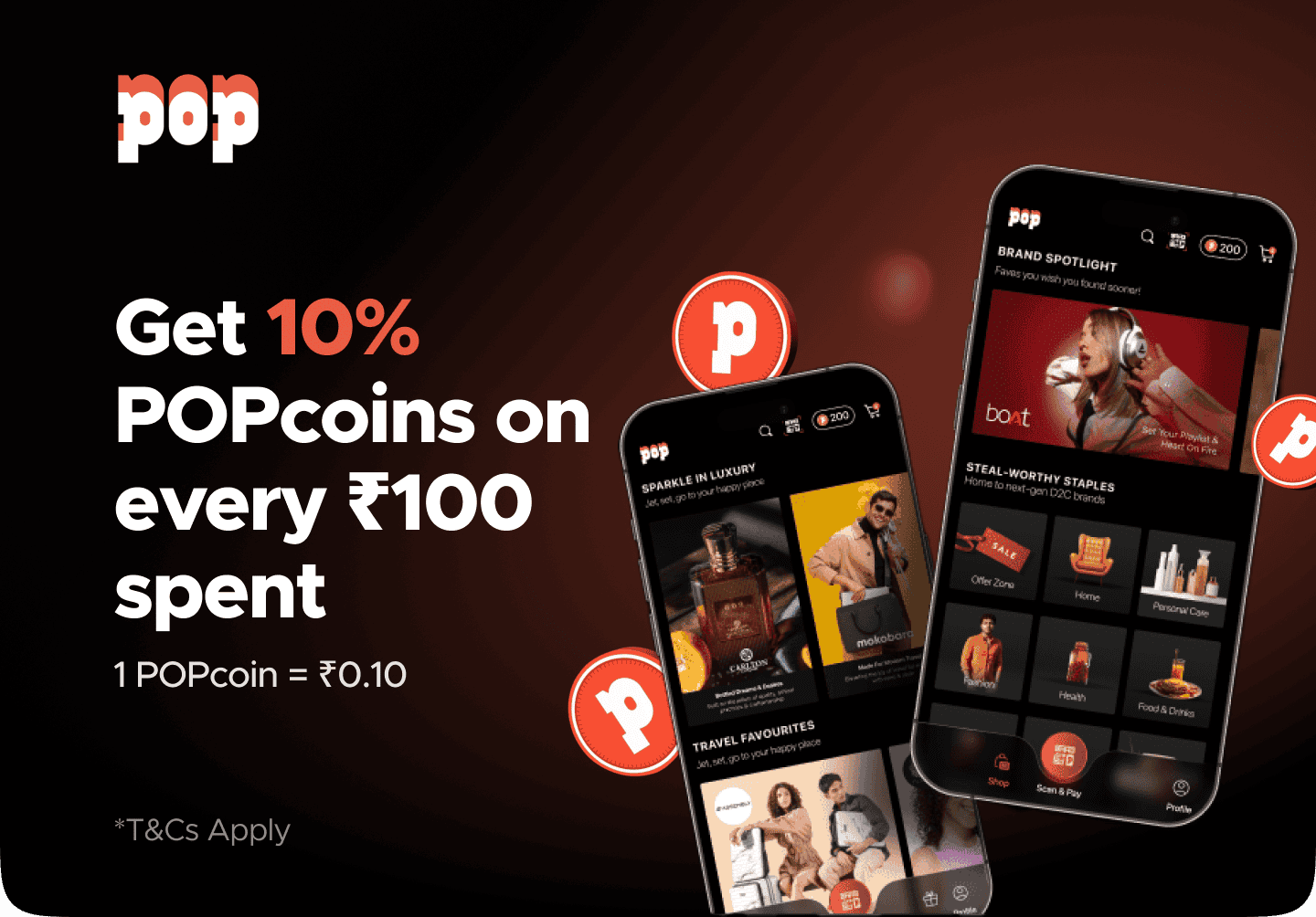 2Earn 10 POPcoins for every Rs.100 spent on online transactions and 2 POPcoins for every Rs.100 spent on offline transactions