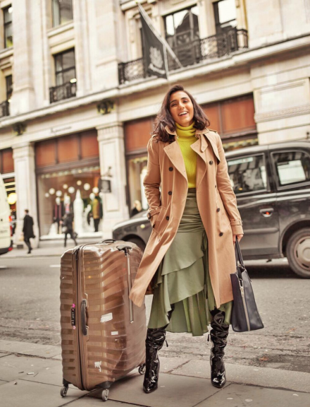 Gear up to strut as a high street star in this one. Masoom picks an olive green ruffle skirt and a yellow high neck sweater with shiny boots and a trench coat to layer. This look is one for your next vacation in the heart of Milan.